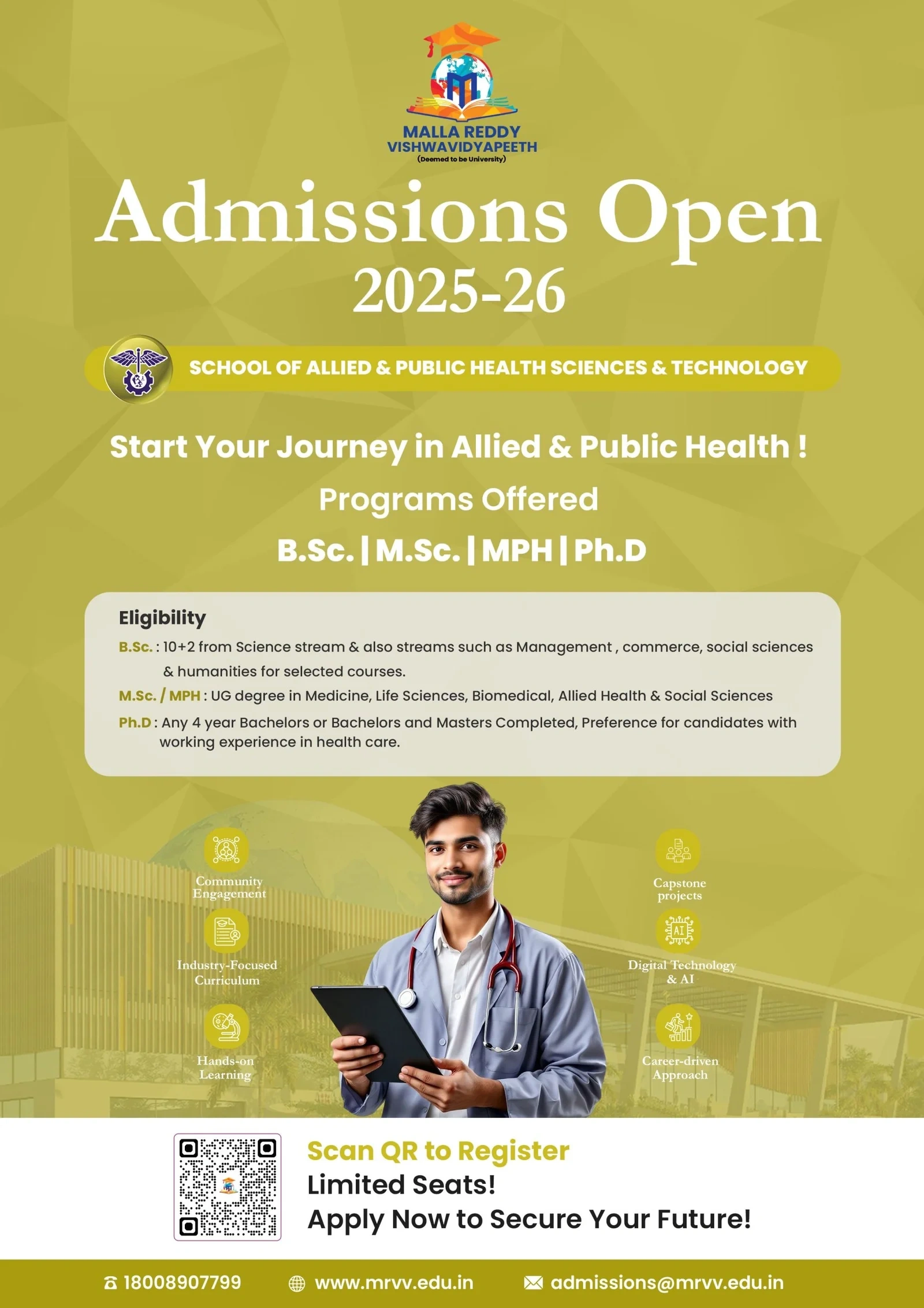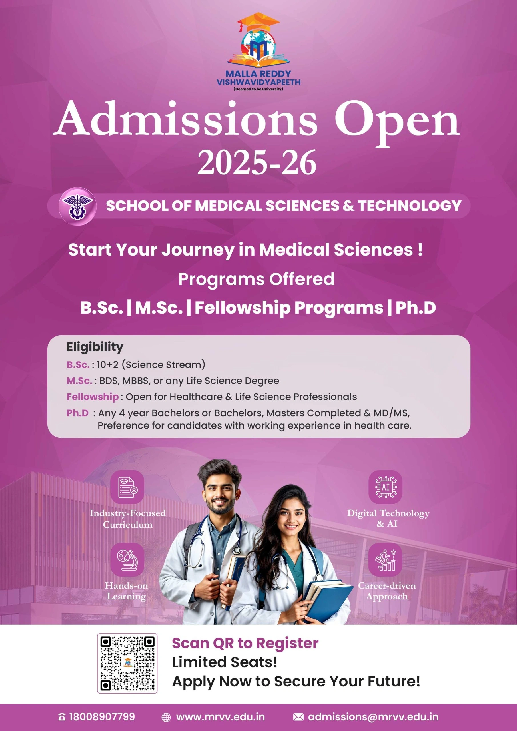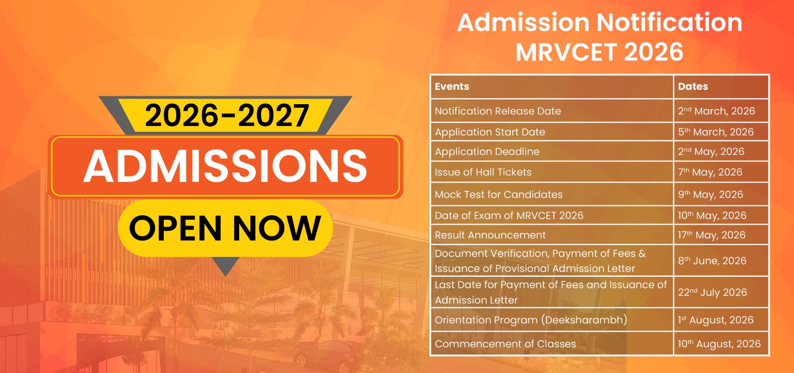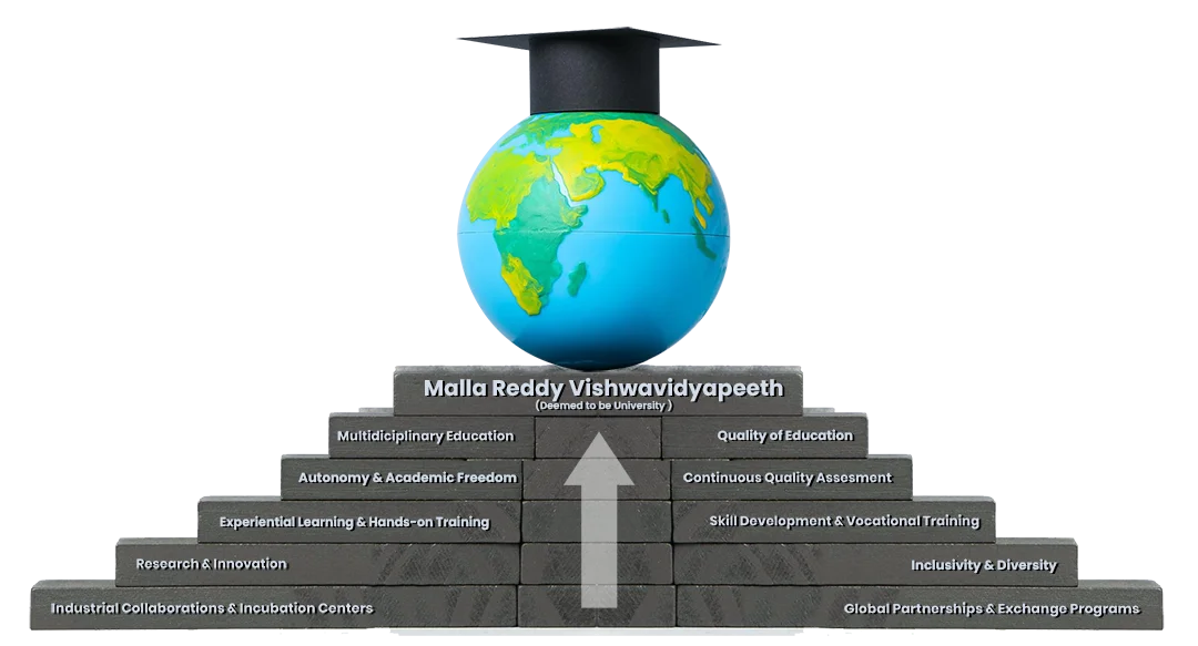 Malla Reddy Vishwavidyapeeth (MRV) presents new era distinct courses under exclusive “Schools of Eminence” delivering Inter-disciplinary Programs with Innovative courses, Unique and Flexible Curriculum with Multiple Entry and Multiple Exit (MEME) option including Choice Based Credit System (CBCS) and Academic Bank of Credits (ABC), Experiential learning, Skill Development with Vocational Training and Value Based Education, Industrial Partnerships and Global Collaborations leading to Holistic Development of the Individual.