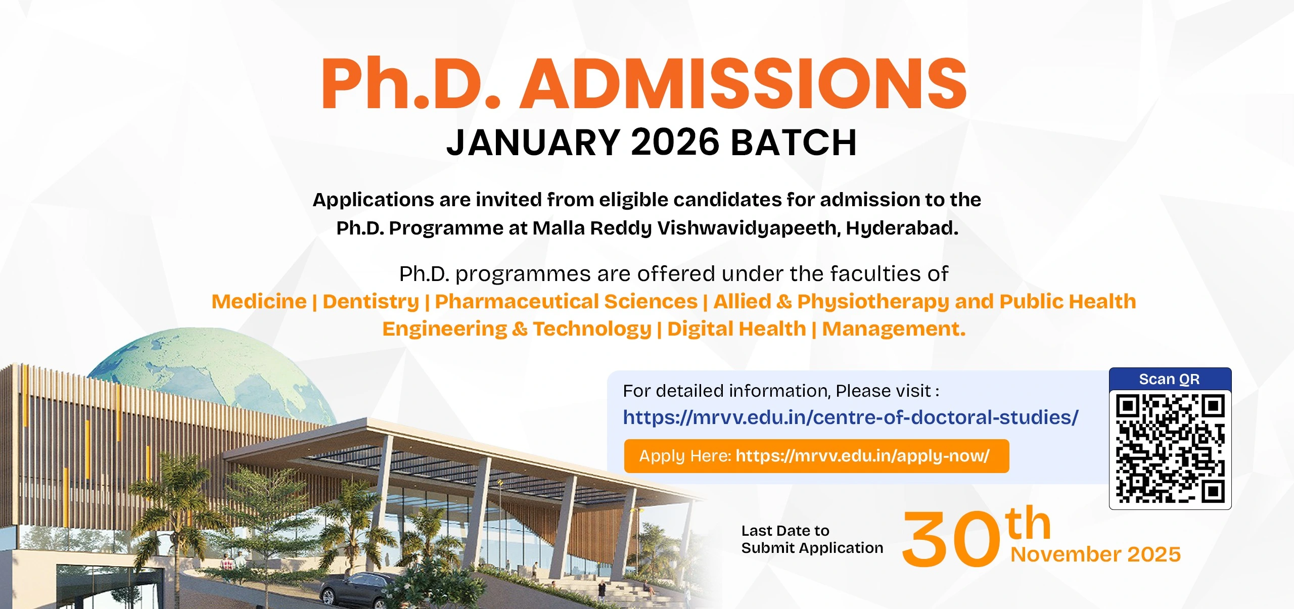 Admissions Open For Jan 2026 “Malla Reddy Vishwavidyapeeth” (MRV) Deemed to be University is sponsored by the Chandramma Educational Society (CES) founded in 2002 by Shri. Ch. Malla Reddy who visioned to evolve a Center of Excellence in the field of education viz Medical Sciences, Dental Sciences, Allied Healthcare Sciences, Pharmaceutical Sciences, Nursing Sciences, Engineering & Technology by creating world-class infra-structure, introducing innovative inter-disciplinary programs, hiring well-qualified and globally trained faculty, nurturing research and innovation, establishing partnerships with industries, fostering international collaborations, promoting talent and engaging in outreach activities.