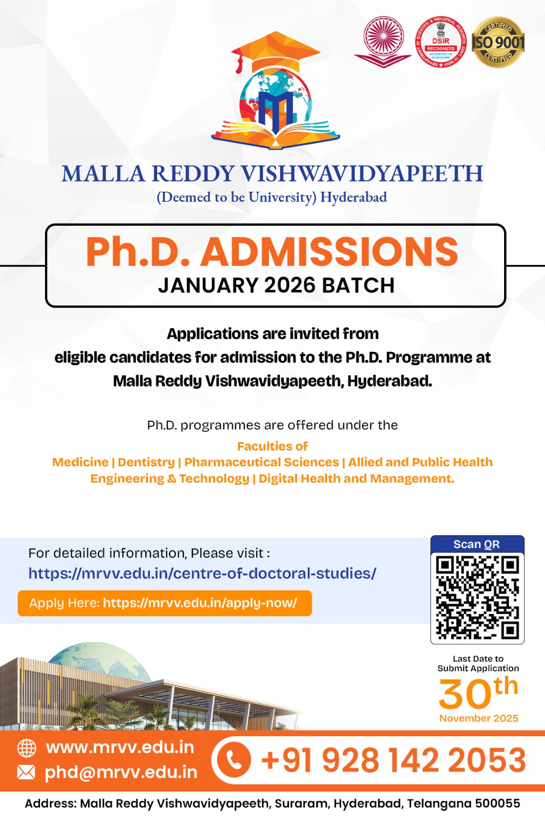 The Ph.D. program at Malla Reddy Vishwavidyapeeth (MRV) is committed to academic excellence, multidisciplinary research, and societal impact. In line with UGC’s 2022 regulations, it ensures rigorous, merit-based admissions and upholds the highest standards of integrity and transparency. MRV provides a vibrant research environment to nurture innovation, knowledge creation, and human development.